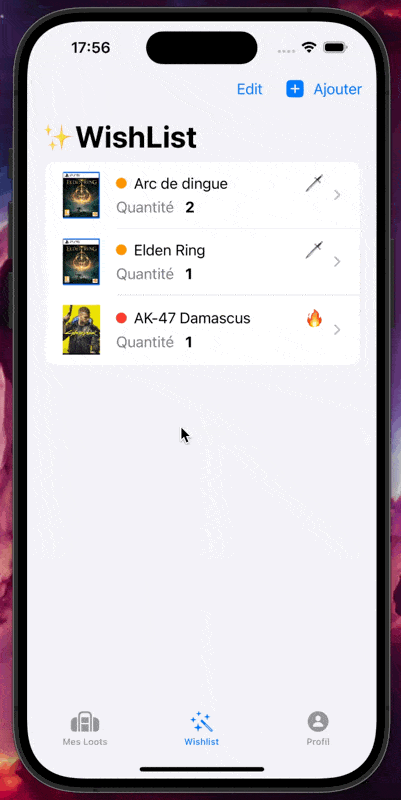 • Avoir une liste commune de loot et de wishlist avec un discriminant (ex: isWishList: Bool)